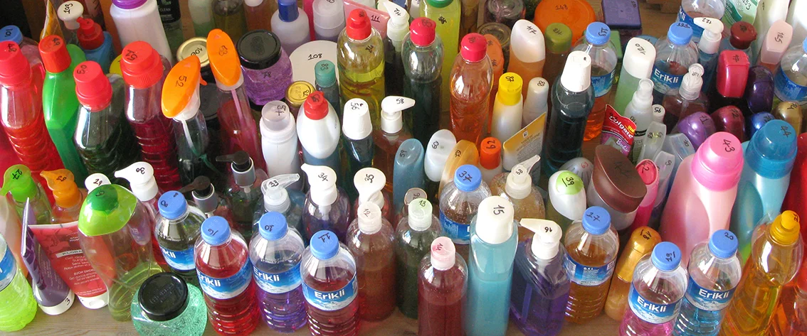 Daily use products of care and cleaning for body and home. Various surface cleaners, WC gels, tooth pastes, mouth washes, shower gels, detergents, softeners, face wash gels, face and body peelings, hand soaps...