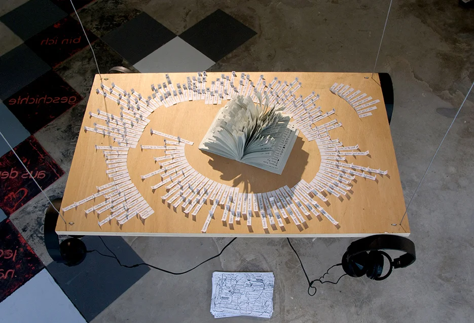 The text is made up of 276 track names, also written in the book and it is spread in a spiral form around the book that is laying open on the surface hung from the ceiling. This poetic text comments on a particular culture bubbling in Berlin that was once underground, and that is evolved with the generous nourishment of infinitely continuous music. This vague imagery of a night out in Berlin involves moods, atmosphere and a sense of the city vibe.