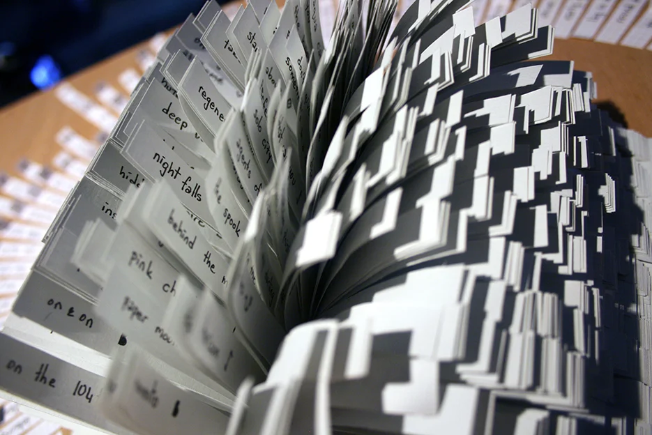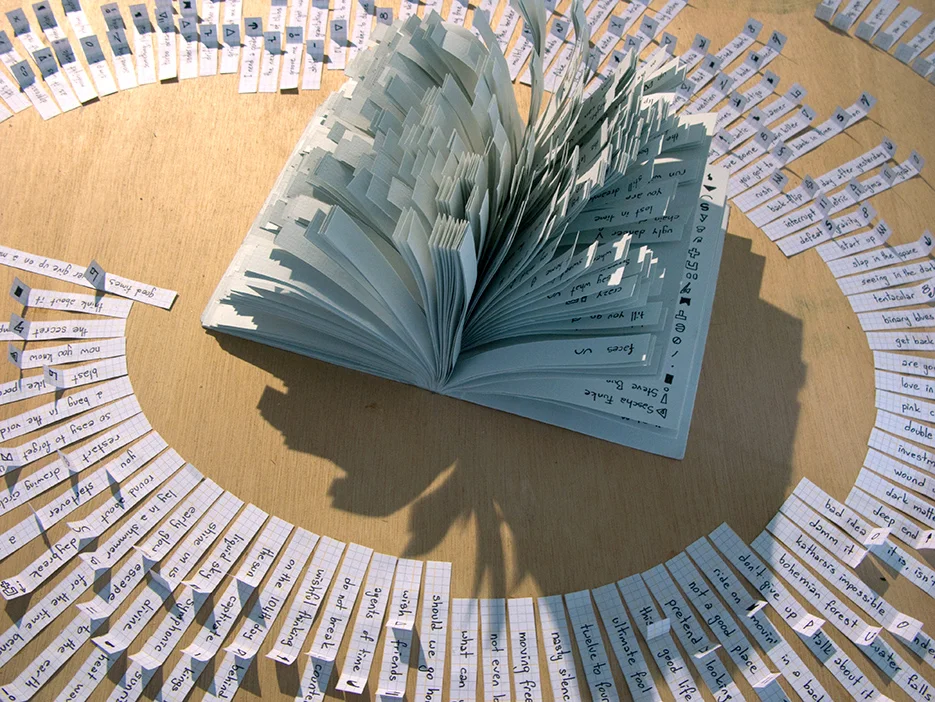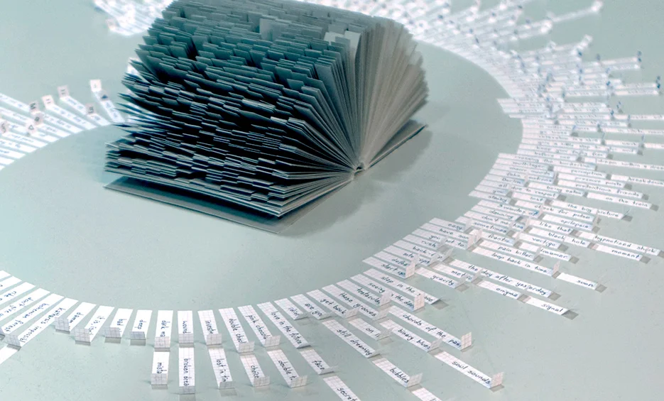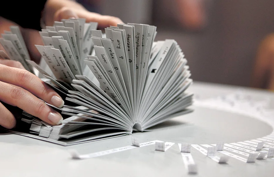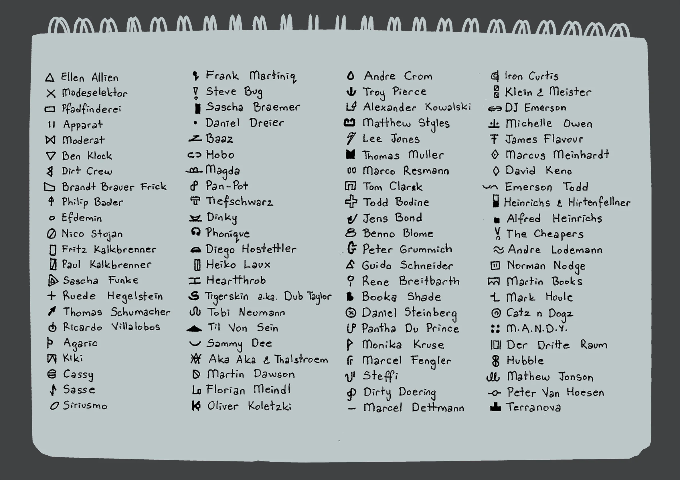 The book contains, 1488 track names by 88 electronic music producers who are currently based in Berlin and a list of those artist’s names with a designated sign. Each page of the book is cut into 12 stripes and on each stripe, a track name and a sign indicating the name of the producer is written. It’s a book of unlimited short text generator created from within electronic music.
