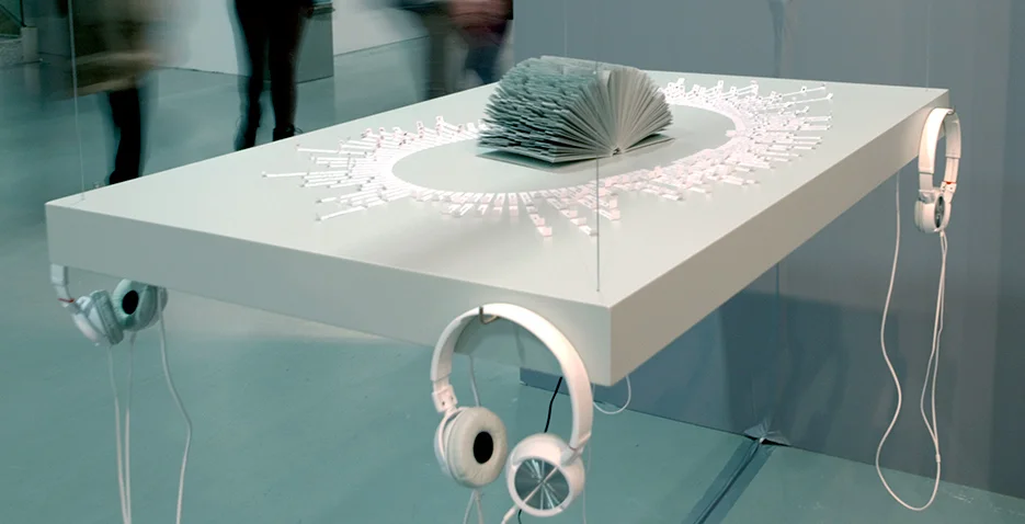 The audio piece, which spreads out between the genres of Techno and House music has a DJ set structure. Only, it is produced according to the text, not to the musical harmony of tracks with one another. This 2 hour long audio track is a mix of small bits of 276 tracks that made up the text, and arranged in the same order with their titles forming the text. As part of the installation the audio piece plays in the loop, simultaneously from four headphones.