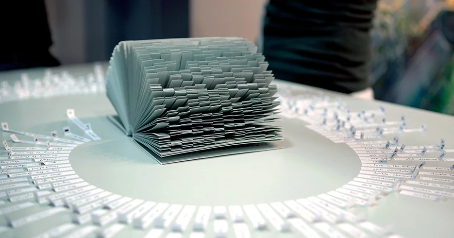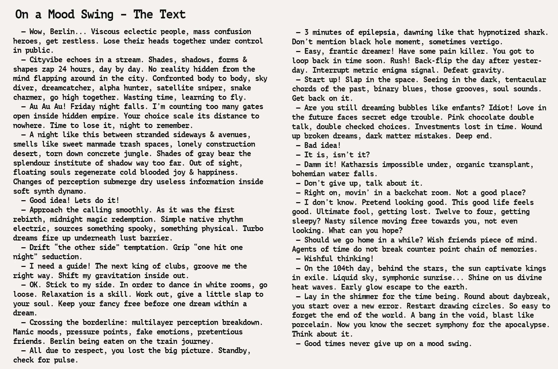 On a Mood Swing is a work that is influenced by electronic dance music echoing in the city of Berlin. The installation is a vague audio-textual story on a night in Berlin that is written with the titles of electronic music tracks produced by Berlin based artists. The work is comprised of three parts, a book, a text and a audio piece.